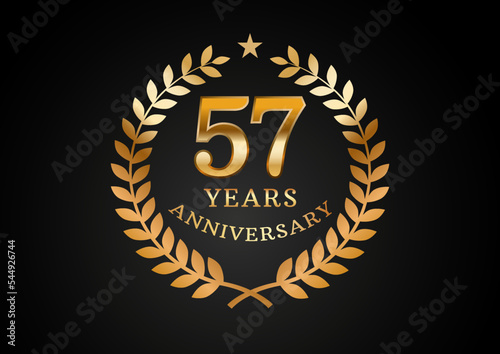 © Cipta, Fototapeta premium Vector graphic of Anniversary celebration background. 57 years golden anniversary logo with laurel wreath on black background. Good design for wedding party event, birthday, invitation, brochure, etc