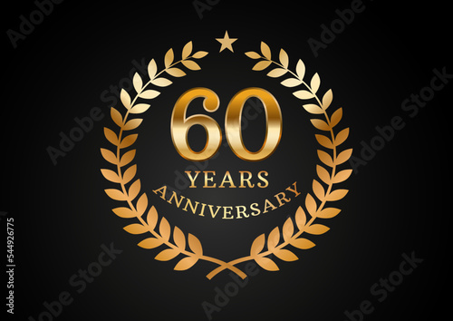 © Cipta, Naklejka premium Vector graphic of Anniversary celebration background. 60 years golden anniversary logo with laurel wreath on black background. Good design for wedding party event, birthday, invitation, brochure, etc
