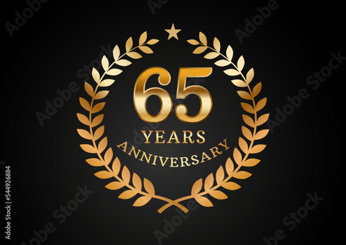 © Cipta, Naklejka premium Vector graphic of Anniversary celebration background. 65 years golden anniversary logo with laurel wreath on black background. Good design for wedding party event, birthday, invitation, brochure, etc