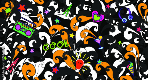 Fototapeta premium Vector graphics. Background with plant elements and many different items. Youth background.