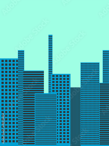 Obraz premium Vector graphics - blue rectangular modern skyscrapers with windows against the sky in a large industrial city and a space to copy.