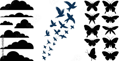 © Kalsoom, Naklejka premium Vector graphics of clouds birds and butterflies silhouettes for design elements and creative projects use 100 editable stock vector illustration