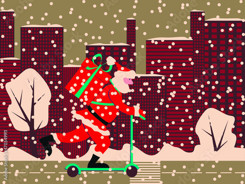 Fototapeta premium Vector graphics - Santa Claus in a red suit rides along the road on a scooter with a big gift on a street with tall modern houses and snowfall. Concept Christmas greeting card