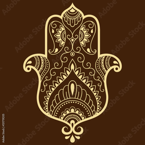 © Katikam, Fototapeta premium Vector hamsa hand drawn symbol. Decorative pattern in oriental style for the interior decoration and drawings with henna. The ancient symbol of the " Hand of Fatima ".