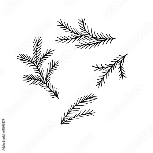 Naklejka premium Vector hand-drawn black and white illustration of Christmas tree branches. Doodle Christmas tree branches on a white background.