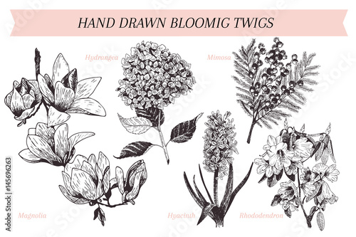 © logaryphmic, Fototapeta premium Vector hand drawn spring blossoms poster. Engraved botanical art. Vintage illustration. Mimosa, hyacinth, magnolia, rhododendron, hydrangea.