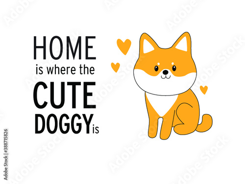 © olga, Obraz premium Vector hand drawn typography poster with a cute puppy dog. Home is where a cute doggie is. Inspirational and motivational illustration. Vector little dog. Chihuahua. dog in a green sweater. shiba