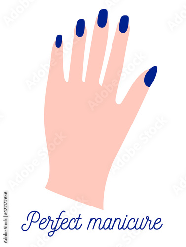Obraz premium Vector hand with blue manicure. Vector illustration with text for stickers,...