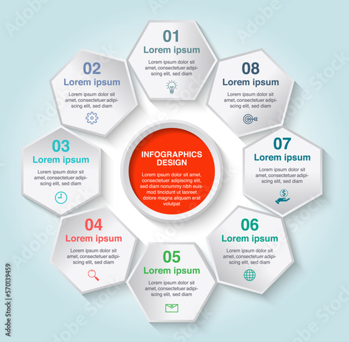 Fototapeta premium Vector hexagon infographic design template with 8 options or steps, modern element design