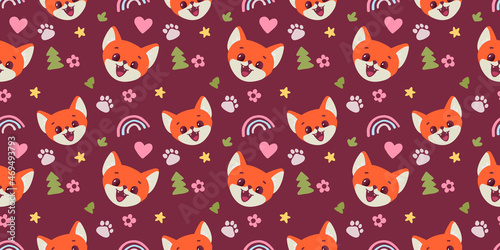 © wowomnom, Fototapeta premium Vector horizontal illustration of muzzle of happy red fox character with rainbow and fir tree on dark color background. Flat style design of seamless pattern with face of animal fox