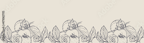 © drutska, Obraz premium Vector horizontal seamless border with hand darwn persimmon. Eps 10. Line-art botanical illustration. Fruits backdrop