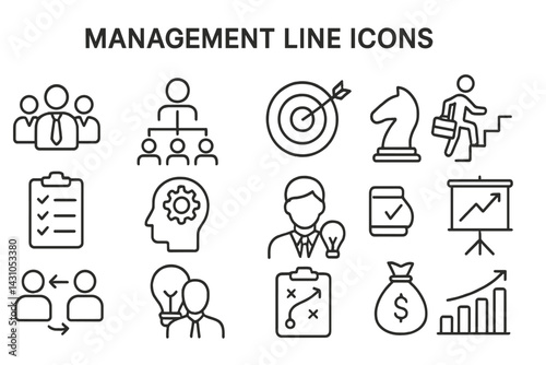Fototapeta premium Vector icon set featuring management themes including teamwork, strategy, and...