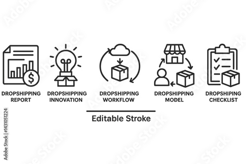 Fototapeta premium Vector icon set illustrating dropshipping concepts including report, innovation, workflow, model, and checklist for eCommerce