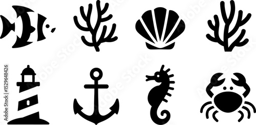 Fototapeta premium Vector icons of sea animals fish seahorse crab seashell coral anchor and lighthouse illustration art editable stock vector illustration