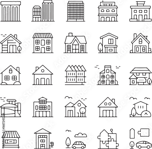 Fototapeta premium Vector icons representing real estate concepts including houses, sales, and...