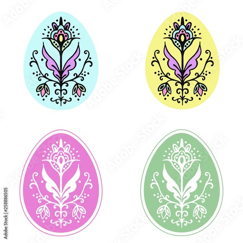 © Elizabeth, Fototapeta premium Vector illustration. Beautiful set with easter eggs. Without black edging. Yellow egg. Pink, green eggs with white floral ornament.Without background. EPS.