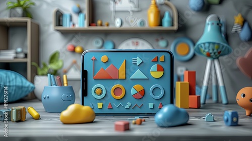 Obraz premium vector, illustration, 3d hand holding smartphone, graph, piechart, lamp...