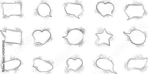 Fototapeta premium Vector illustration. Funny dotted banners. Retro comic empty speech bubbles set. Vintage design elements for poster, cover, layout, brochure, magazine, card. Pop art style. Set of 15 graphic elements