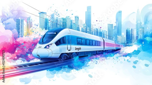 © imlane, Fototapeta premium Vector illustration, gradient color background with light blue and white tones, text "length", large font, modern city buildings, sky train, cloud pattern, floating fish tail, abstract geometric shape
