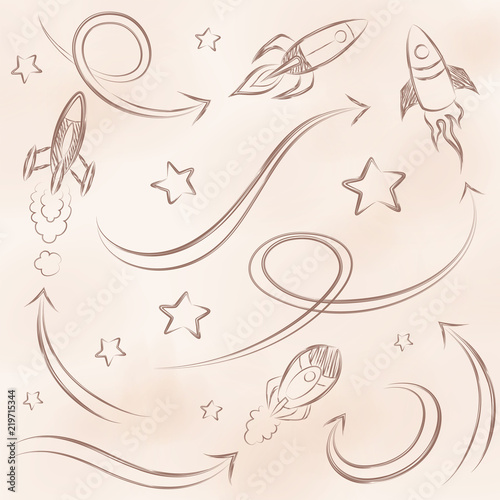 © Pavika, Fototapeta premium Vector illustration hand drawn pencil rocket, star and arrow