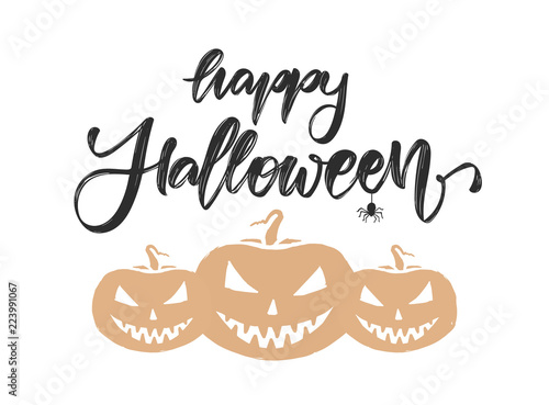 Fototapeta premium Vector Illustration: Handwritten brush type lettering of Happy Halloween. Greeting card with pumpkins
