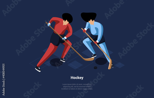 © Intpro, Obraz premium Vector Illustration In Cartoon 3D Style. Isometric Composition On Dark Background With Writing. Two Male Characters In Red And Blue Uniform Playing Hockey. People Training For Active Winter Sport Game