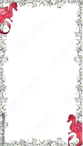 Fototapeta premium Vector illustration is showing paired red dragons framing vine border on...