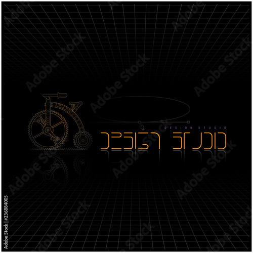 © akser, Obraz premium vector illustration made from the text of the "design studio" drawing a bicycle on a black background.