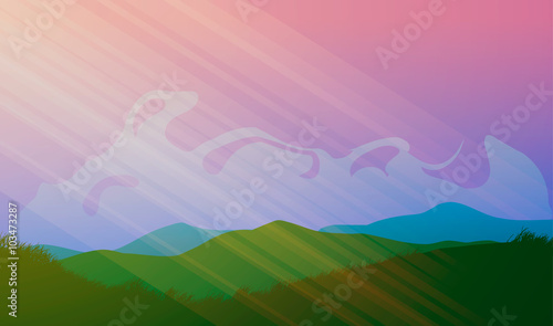 © evgenii141, Obraz premium Vector illustration. Meadows and mountains at sunset