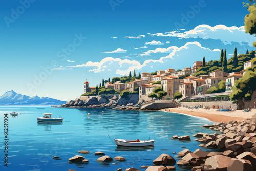 Naklejka premium Vector Illustration of a cozy coastal Mediterranian Town, Generative AI