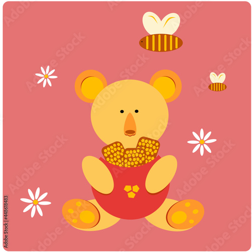 Fototapeta premium Vector illustration of a cute bear. Teddy bear with honey in its paws. Teddy. Bees over the bear. Chamomile. Bear postcard with bees and honey.