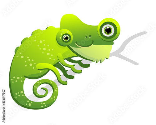 Obraz premium Vector illustration of a funny cartoon chameleon isolated on a white background. Can represent nature, wildlife, eco friendly, environment protection, conservation, the tropics, forest, animals.
