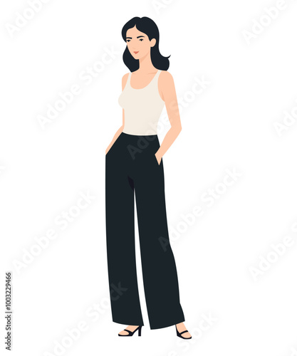 Fototapeta premium Vector illustration of a girl in a minimalistic look with a white top and black pants, suitable for everyday wear.