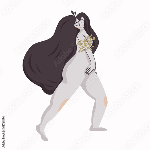 © Darya Parfenova, Obraz premium Vector illustration of a girl with flowers wrapping around her chest. A girl with long black hair. Illustration for posters, postcards, decor, printing.