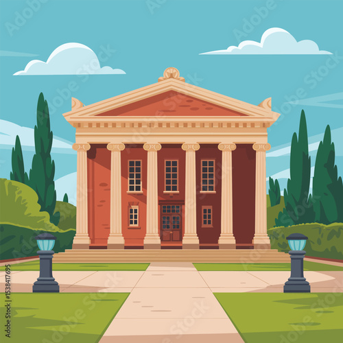 © Alvi, Naklejka premium Vector illustration of a grand neoclassical building with columns and a well manicured landscape perfect for educational or historical themes