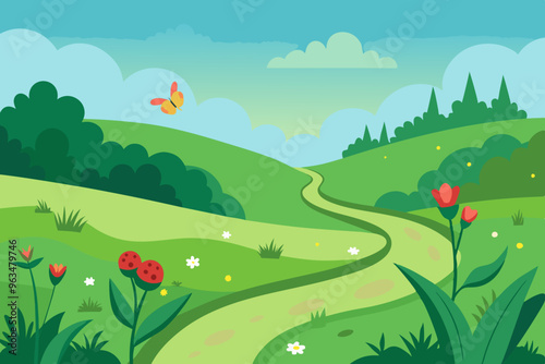 Fototapeta premium Vector illustration of a lush green meadow with wildflowers landscape.
