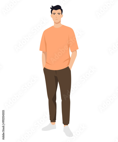 © NelaRov, Fototapeta premium Vector illustration of a man in an orange t-shirt and dark pants