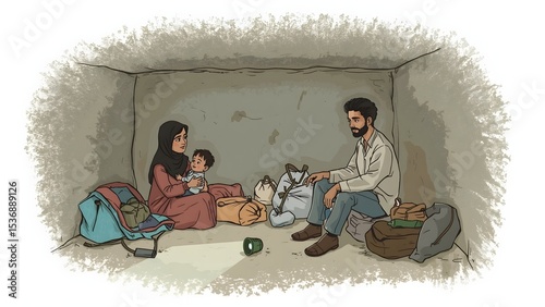© Swetlana, Obraz premium Vector illustration of a Middle Eastern family in a shelter during conflict. Parents and child huddled quietly. Soft colors, minimal detail, white background. Humanitarian and symbolic.