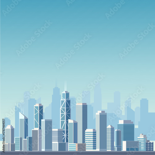© KertasKu, Naklejka premium Vector illustration of a modern cityscape featuring tall buildings, skyscrapers, and urban architecture. Perfect for business backgrounds, real estate projects, travel design, city concepts, and web