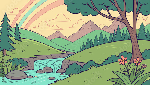 © Adobe, Naklejka premium Vector illustration of a serene landscape with rainbow, mountains, and waterfall