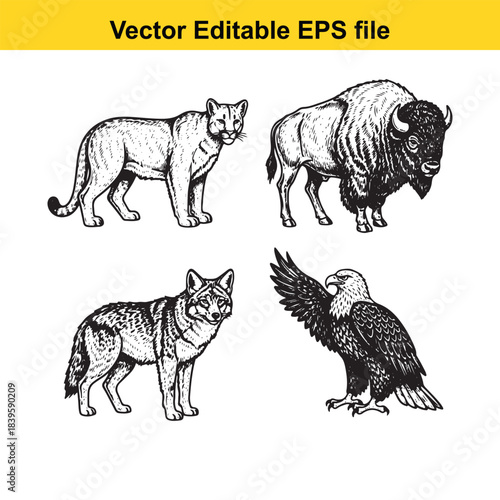 Naklejka premium vector illustration of a wolf, bison, eagle and another wolf in editable eps format for digital and print use
