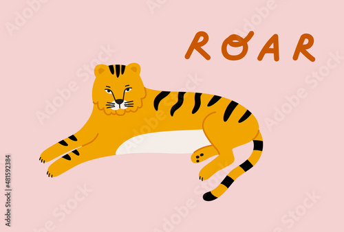 Fototapeta premium Vector illustration of a yellow lying tiger, with lettering 'roar'. Hand-drawn bright cartoon vector tiger. Large mammal of the cat family. Animals of Asia.