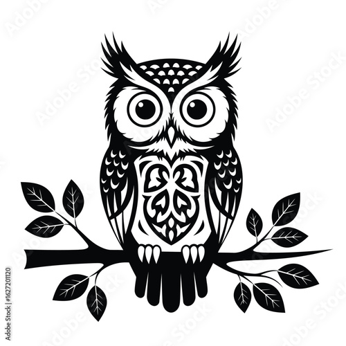 © MD, Fototapeta premium Vector illustration of Black silhouette of an ornate owl perched on a branch with leaves bird