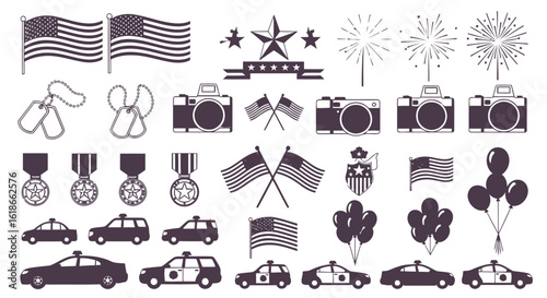 Fototapeta premium Vector illustration of collection of american patriotic symbols including flags, medals, police cars, cameras, fireworks, and balloons, isolated on a white background