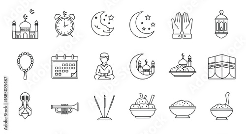 © Riyal, Naklejka premium Vector illustration of collection of islamic icons and symbols, including mosques, prayer, calendar, and crescent moon