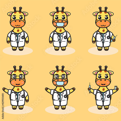 © Heru, Naklejka premium Vector illustration of cute Giraffe Doctor cartoon. Cute Giraffe expression character design bundle.