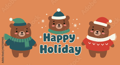 Obraz premium Vector Illustration of Cute Little Bear Characters with “Happy Holiday” Text for Greeting Card