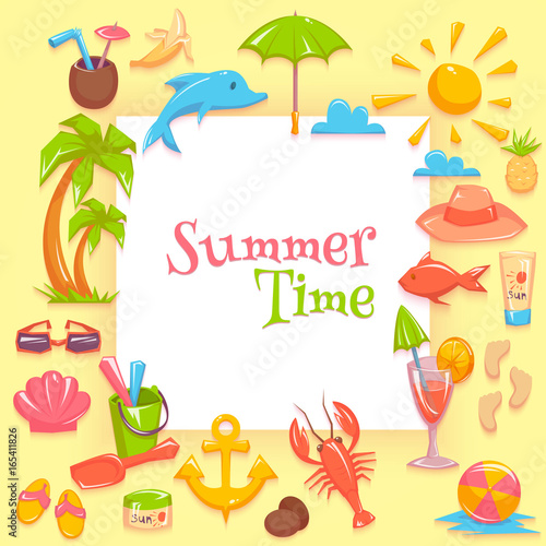 Fototapeta premium Vector illustration of different things for vacations rounding the frame with summer time lettering.