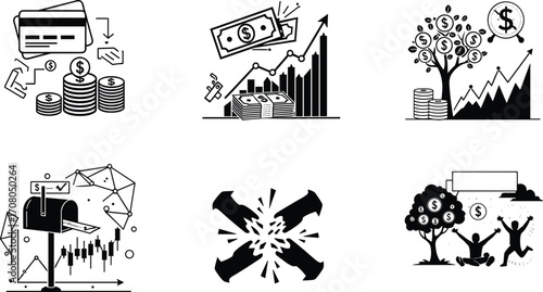 Fototapeta premium Vector illustration of finance concepts with credit cards, money growth, investment strategy, wealth tree, financial conflict, market analysis, economic discussion, banking