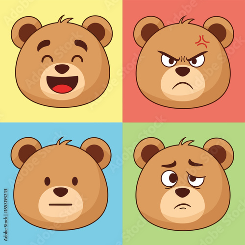Fototapeta premium Vector illustration of four cute bear faces showing different emotions and...
